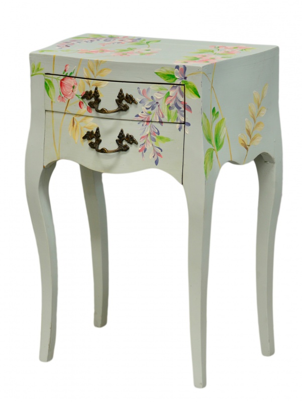 Kouzelný a romantický stolek Riviera v uklidňující světlounce modré barvě s malbou květin obsahuje dva praktické šuplíky. Zkrášlete svůj domov něčím neobvyklým. Tento kousek vám k tomu snadno dopomůže!