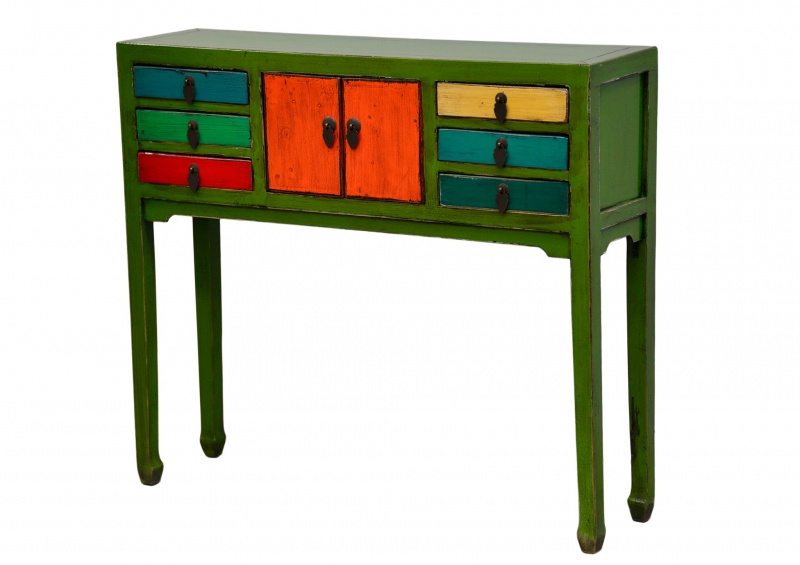 Tmavě zelený podlouhlý stolek na vysokých rovných nohách se stane oblíbenou součástí vašeho obývacího pokoje, pracovny, ložnice i dětského pokojíčku. Je vyroben z masivního dřeva, má 6 praktických pestrobarevných zásuvek, které perfektně ladí k jakémukoliv interiéru a úložný prostor s dvířky. Nenechte se vystrašit barevností a neotřelým nápadem a zútulněte váš domov výrazným kouskem.
