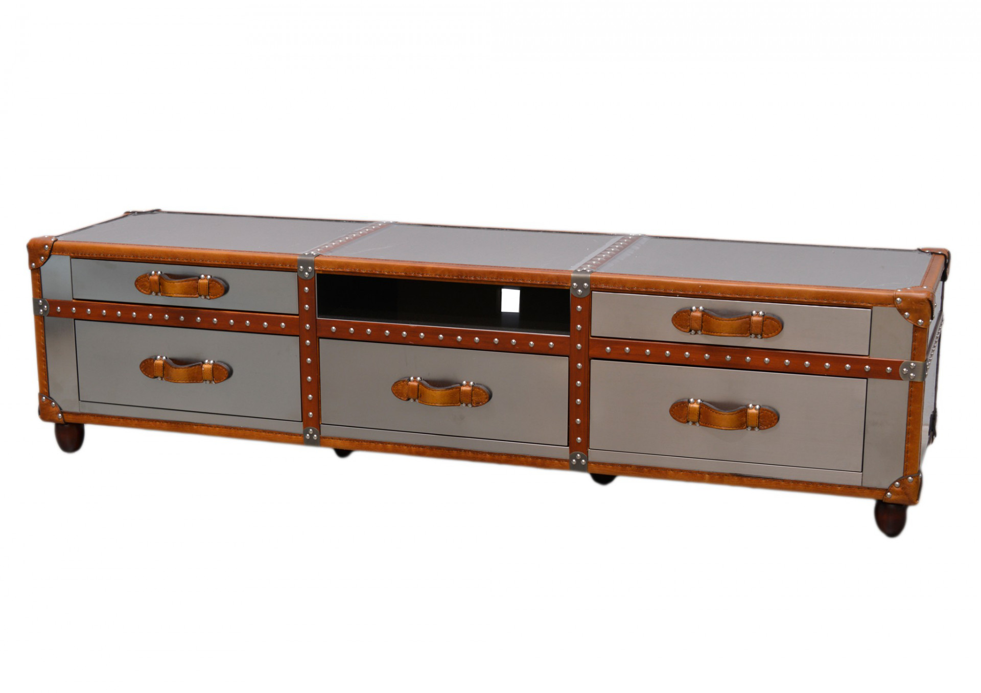 Máte rádi luxus a neobvyklost? Tato skříňka pod televizi by vám mohla padnout do okna. Kombinací nerezavé oceli a pravé kůže si získá nejednoho příznivce či obdivovatele. Kůže je zvolena zcela decentně na všech hranách a rozích se zdobenými cvoky, v zádech skříňky je otvor pro veškerou kabeláž audio-video techniky. Skříňka obsahuje pět praktických šuplíků.