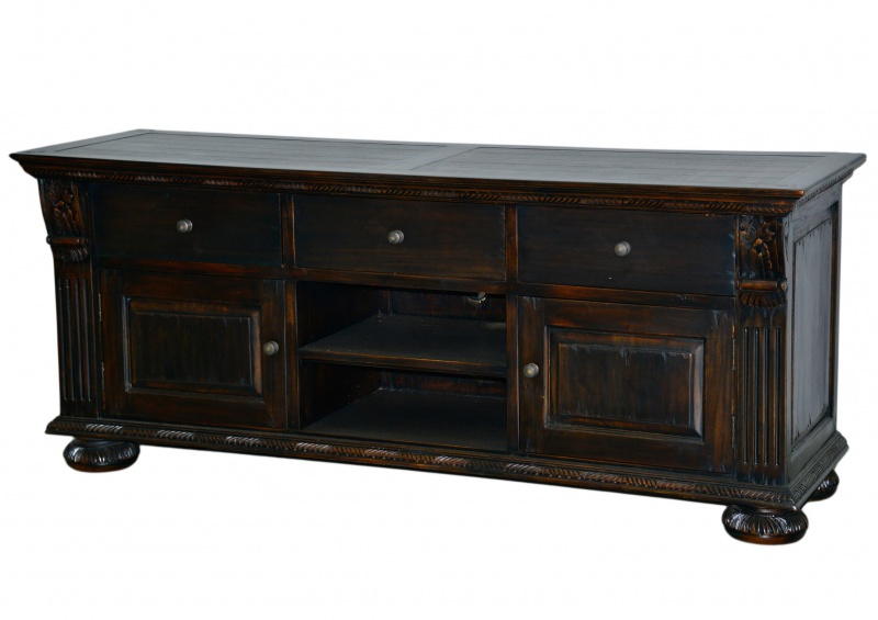 Už se nemůžete dočkat, až svou novou televizi postavíte na nový a k tomu naprosto exkluzivní televizní stolek? Popřemýšlejte o krásném masivním televizním stolku Charleston v honosném designu konzervativní Anglie. Televizní stolek má černou patinu a je vyroben z mahagonového dřeva, které zaručuje jeho bezchybnou kvalitu a dlouholetou životnost. Disponuje praktickým a líbivým designovým uspořádáním se třemi šuplíky, dvěma dvířky a dvěma policemi, které poslouží jako ideální místo pro různé televizní příslušenství. Propracované zdobné vyřezávání jen umocňuje celkový luxusní vzhled tohoto přepychového kousku. Udělejte ze svého obývacího pokoje nanejvýš příjemné a honosné místo, kde můžete v kruhu svých nejbližších trávit ty nejkrásnější chvíle, plné klidu a pohody, a místo, které vám poskytne pocit nenucené důležitosti!