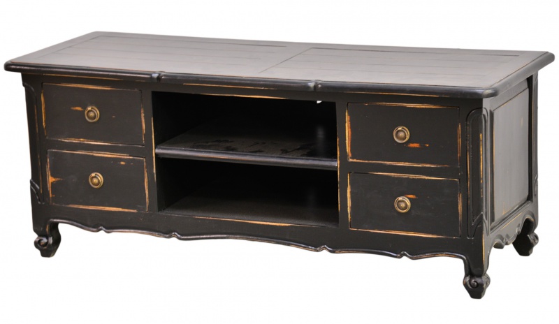 Obývací pokoj je ve většině rodin centrální místností domácnosti, proto by se v něm měl každý cítit dobře a komfortně. Nevíte jak na to? Začněte koupí nádherné skříňky v černé barvě, která má jemnou patinu. Je vyrobena z luxusního masivního dřeva, má čtyři zásuvky, které jsou doladěny krásnými kovovými úchyty, a úložný prostor v podobě police, do které můžete uložit dokumenty, časopisy či vaše oblíbené DVD. Je jen na vás, jestli skříňku dáte do ložnice, nebo ji použijete v obývacím pokoji jako televizní stolek.