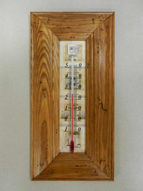 Teploměr zarámovaný v ručně vyrobeném rámu.