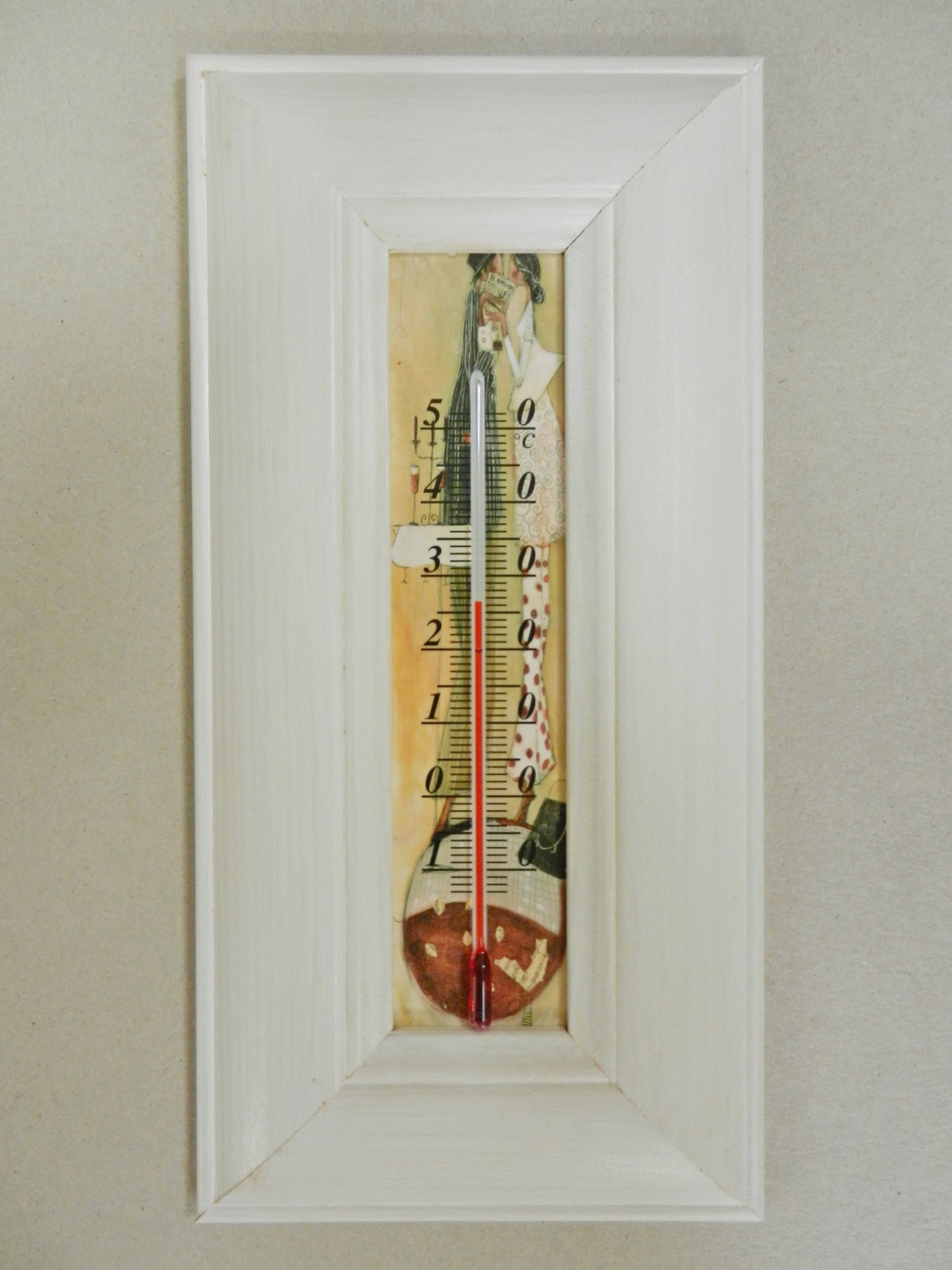 Teploměr zarámovaný v ručně vyrobeném rámu.