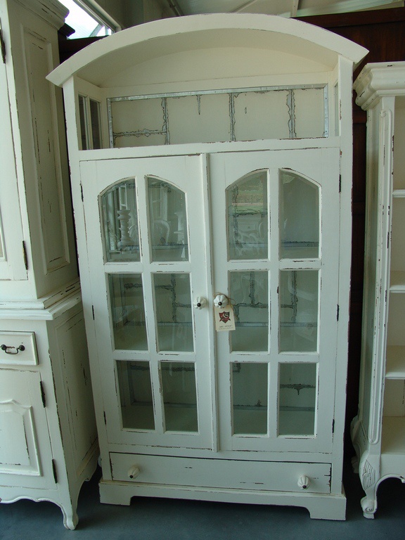 Mahagonová knihovna/vitrína, bílá barva, záda oplechovaná.