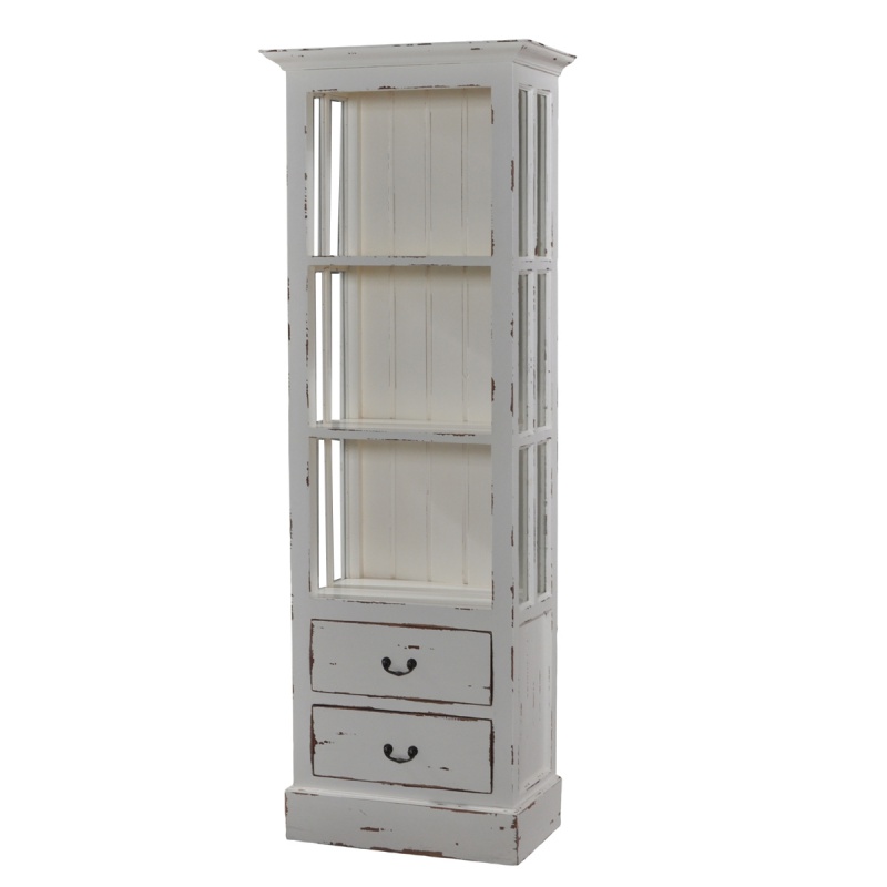 Vitrína Cape Cod v bílé zastřené barvě s oprýskaným efektem je tím nejvhodnějším kouskem pro zaryté romantiky a milovníky půvabného stylu Provence! Vrchní část vitríny je po stranách prosklená a je rozdělena na tři policové díly, které poskytnou ideální místo pro vystavení vašich oblíbených dekorací, či uložení knih. Dvě zásuvky ve spodní části mohou být naopak vhodným místem například pro uložení tiskovin a dokumentů. Vitrína je vyrobena z mahagonového dřeva, což zaručuje její kvalitu a dlouhodobou životnost. Dodá svěží nádech každé místnosti, kam se ji jen rozhodnete umístit, ať už se jedná o jemně laděný obývací pokoj, nebo romantickou jídelnu.