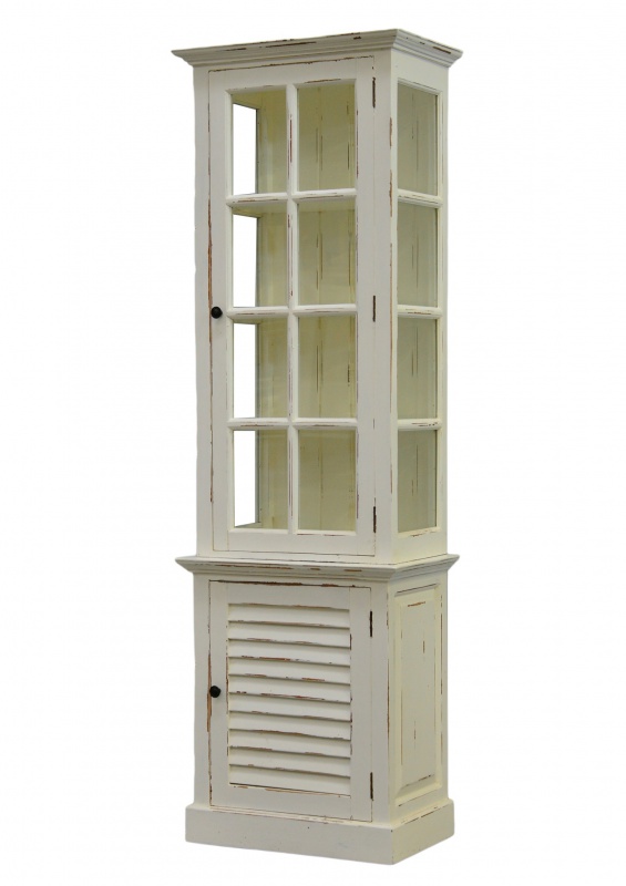 Luxusní světlá vitrína s atypicky řešeným úložným prostorem vás okouzlí. Vrchní část s policemi je ze tří stran prosklená, a tak se dokonale hodí pro vystavení oblíbeného porcelánu či skleněného nádobí, památečních předmětů a upomínek. Spodní část je menší a celá z mahagonového dřeva. Rozjasněte svůj obývák, ložnici nebo pracovnu krásným Provence kouskem!
