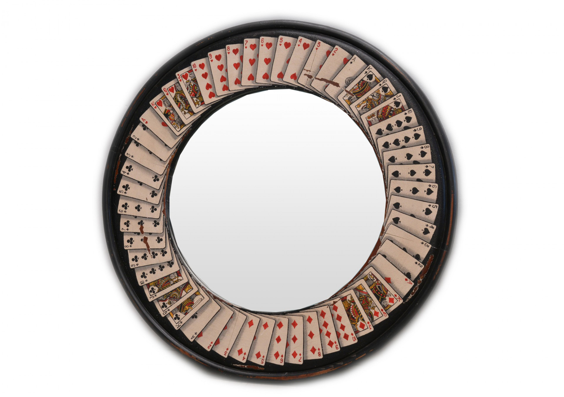 Kulaté zrcadlo s motivem herních karet je vyrobeno z mahagonového dřeva, na okrajích zrcadla je fazeta.