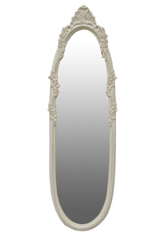 Zrcadlo Portsmith je vyrobeno z mahagonového dřeva v bílé patině, rám zrcadla je ručně vyřezávaný.