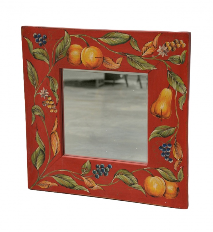 Čvercové dřevěné zrcadlo TinSmith je vyrobeno z mahagonového dřeva a je malováno motivem ovoce. Na okraji zrcadla je fazeta.