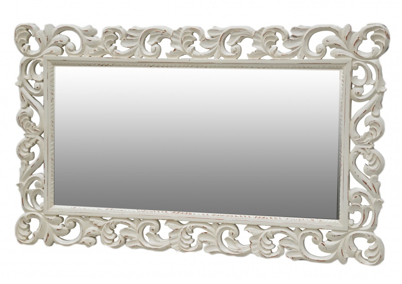 Unikátní vyřezávané zrcadlo z mahagonového dřeva v bílé patina je exkluzivní kousek do interiéru. Zrcadlo má po stranách fazetku a je ručně vyřezávané.